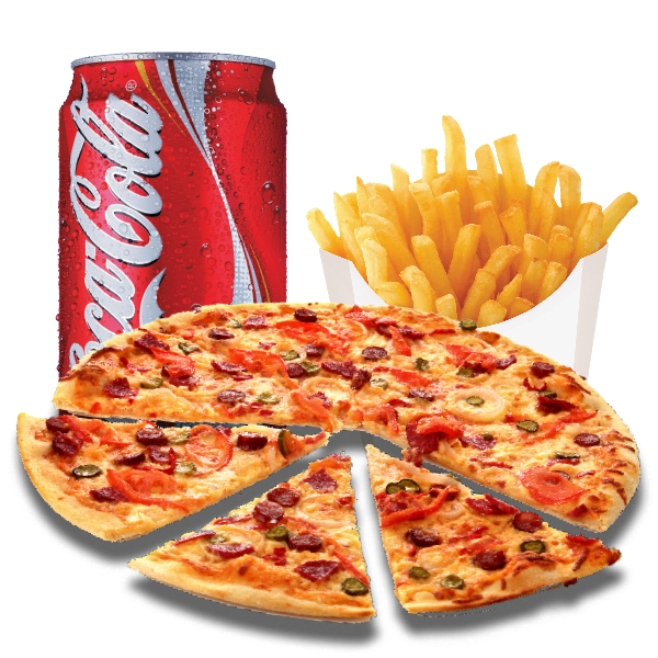 Pizza met frietjes en frisdrank